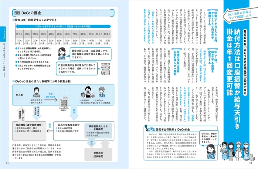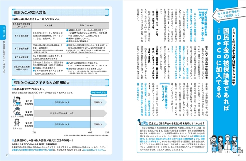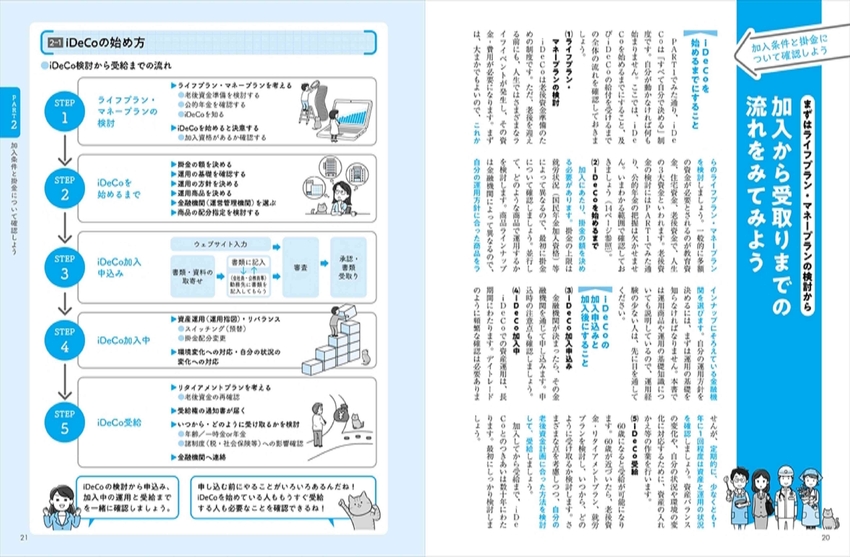 iDeCoがどのような制度で、なぜ必要なのかを説明し、加入・運用・受取までの仕組みや商品選びのポイントを、図解とデータを豊富に用いてビジュアル解説。お役立ち情報や、用語解説、豆知識も充実。